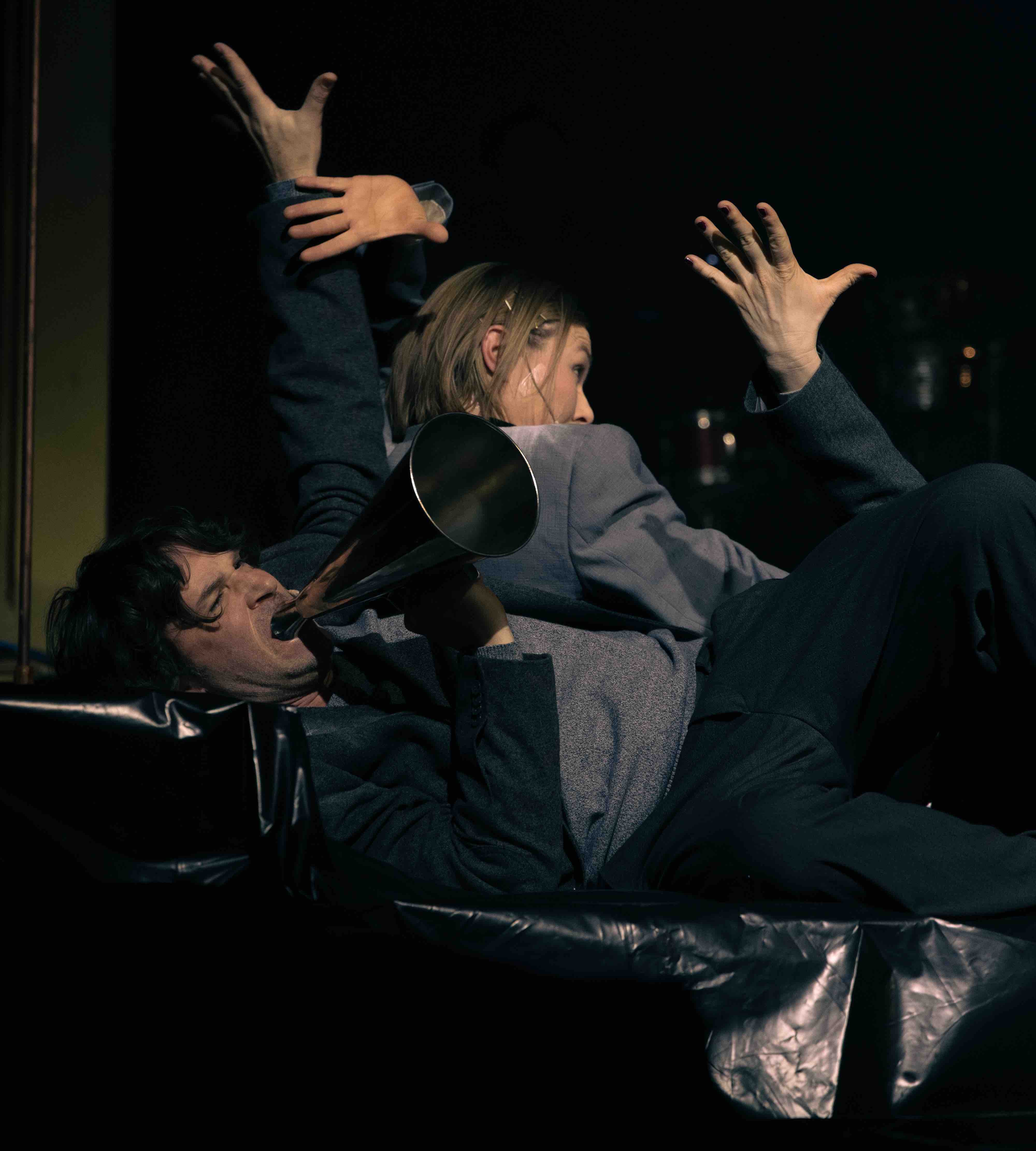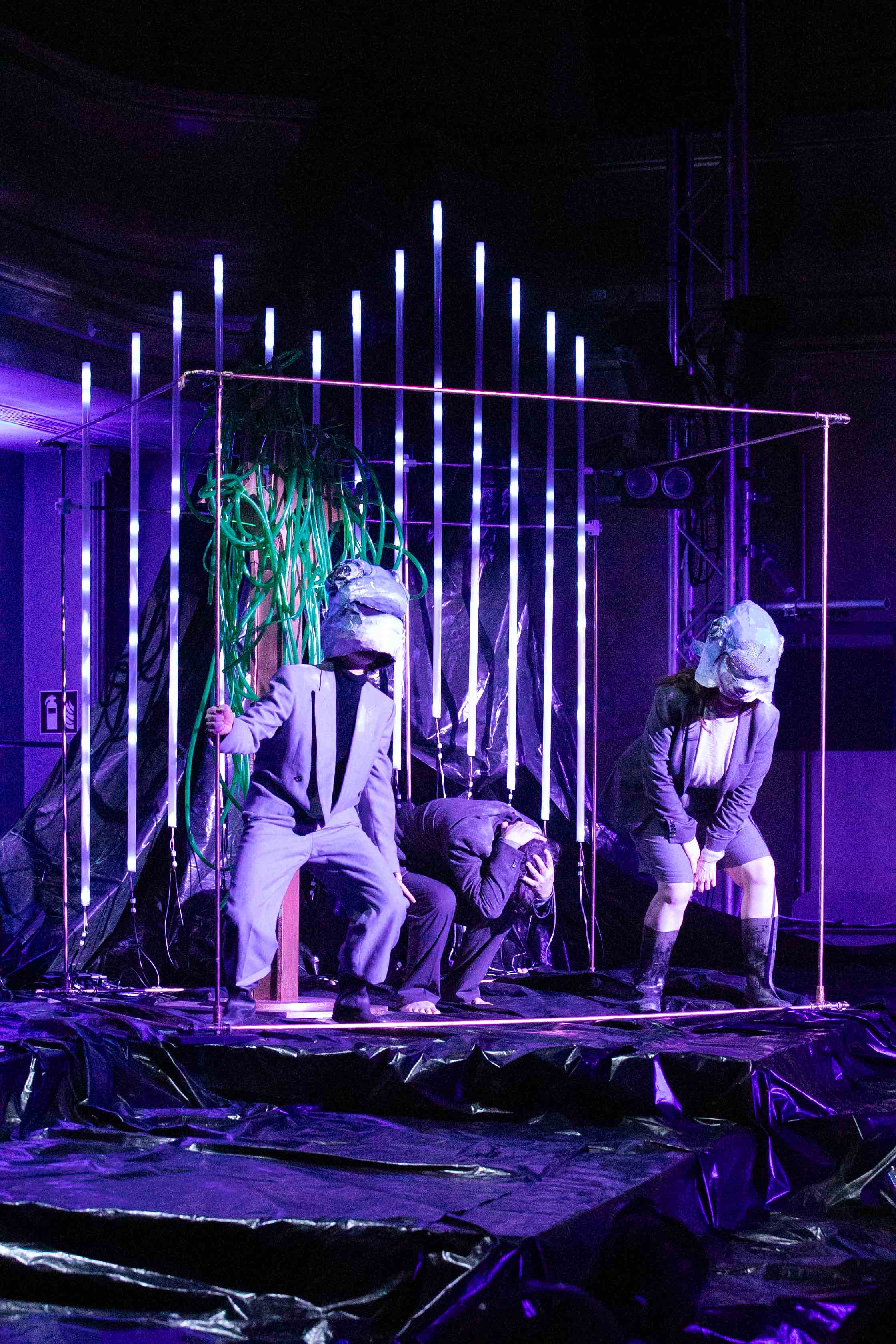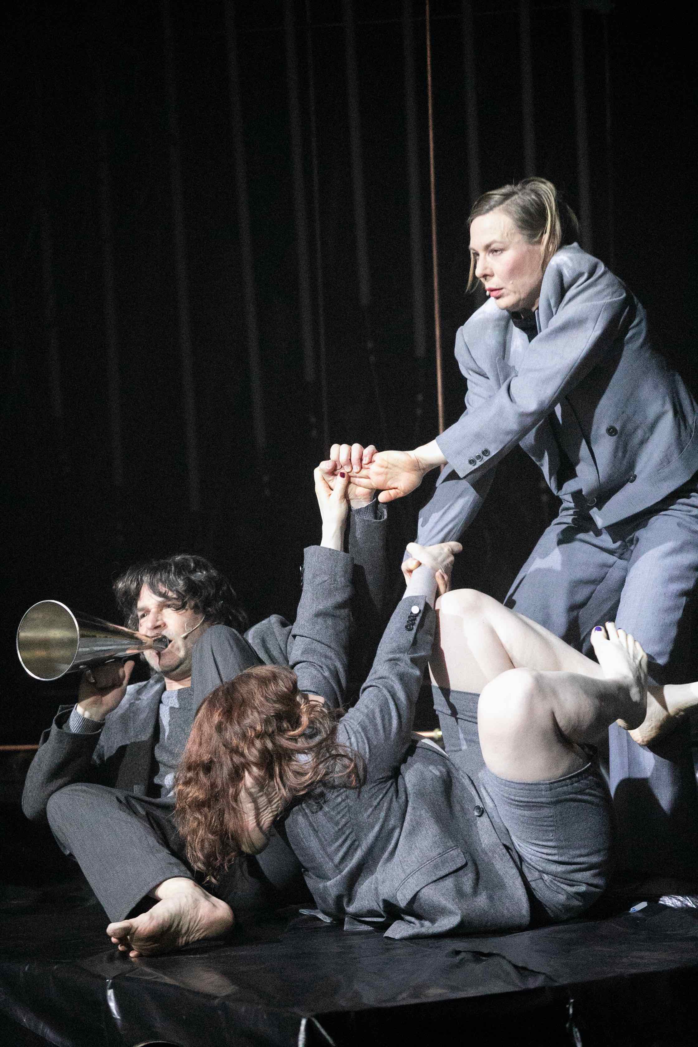 In Aufrecht in die Schräglage erzählt das Musiktheater-Kollektiv mehrblick&ton ein politisches Märchen über den Zustand unserer Gegenwart: das Wasser steigt, die Gewissheiten sinken und drei Vertreter*innen der wankenden Spezies führen eine Wesentlichkeitsanalyse durch, sie vermessen sich selbst, die unsichtbaren Emissionen ihrer Existenz und erzählen dabei die Geschichte einer ertrinkenden Welt. Aufrecht in der Schräglage bilanzieren sie- balancierend zwischen alten Sicherheiten und dynamischen Ungleichgewichten- ihren Gefühlshaushalt und geraten dabei zunehmend in Erfassungslosigkeit.